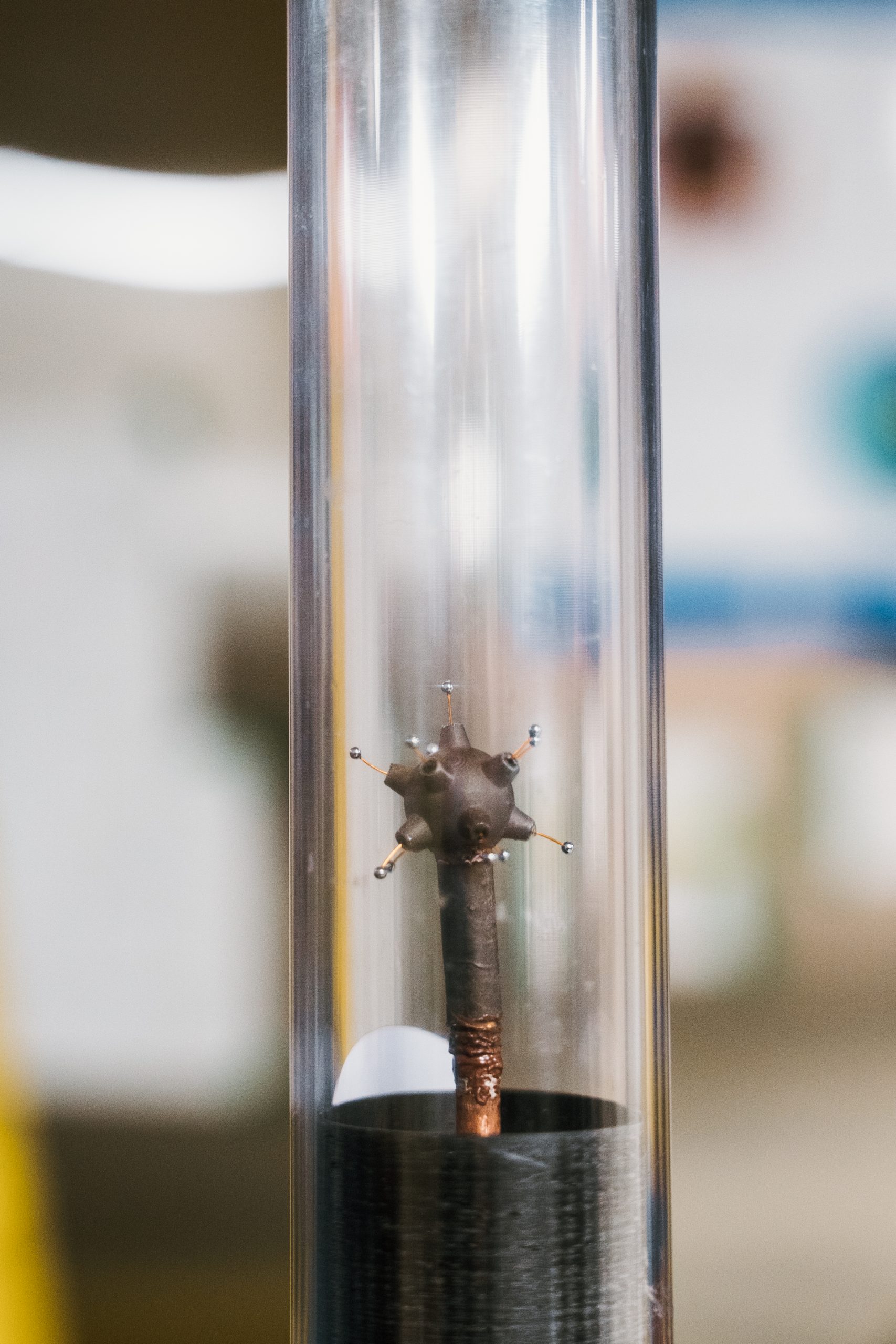 NEWS-G (new experiments with spheres – gas) uses a spherical copper vessel filled with a noble gas to search for dark matter. When a particle enters the sphere it ionizes some of the gas, generating electrons. A sensor in the middle of the sphere held at a high voltage attracts the electrons, creating a charge that can be measured.
