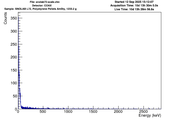 This page provides the results of gamma counting with the Lively HPGe detector at SNOLAB for the sample of interest. Collected spectra are analyzed with a custom C++-based set of scripts. It is a root-based implementation. Peak detection efficiencies are estimated from analyzing the Geant4 MC simulations of the sample. Radioactive contamination levels of the sample from U/Th/K/Co/Cs isotopes are listed per line and per decay chain below.