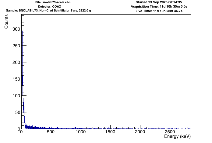 This page provides the results of gamma counting with the Lively HPGe detector at SNOLAB for the sample of interest. Collected spectra are analyzed with a custom C++-based set of scripts. It is a root-based implementation. Peak detection efficiencies are estimated from analyzing the Geant4 MC simulations of the sample. Radioactive contamination levels of the sample from U/Th/K/Co/Cs isotopes are listed per line and per decay chain below.