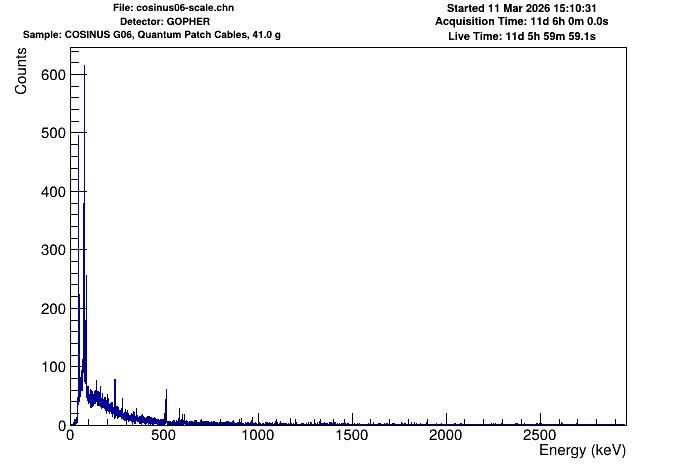 This page provides the results of gamma counting with the Gopher detector at SNOLAB for the sample of interest. Collected spectra are analyzed with a custom C++-based set of scripts. It is a root-based implementation. Peak detection efficiencies are estimated from analyzing the Geant4 MC simulations of the sample. Radioactive contamination levels of the sample from U/Th/K/Co/Cs isotopes are listed per line and per decay chain below.