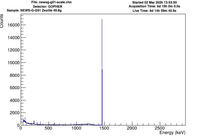 This page provides the results of gamma counting with the Gopher detector at SNOLAB for the sample of interest. Collected spectra are analyzed with a custom C++-based set of scripts. It is a root-based implementation. Peak detection efficiencies are estimated from analyzing the Geant4 MC simulations of the sample. Radioactive contamination levels of the sample from U/Th/K/Co/Cs isotopes are listed per line and per decay chain below.