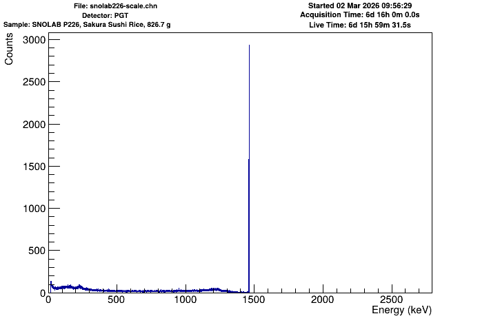 This page provides the results of gamma counting with the PGT HPGe detector at SNOLAB for the sample of interest. Collected spectra are analyzed with a custom C++-based set of scripts. It is a root-based implementation. Peak detection efficiencies are estimated from analyzing the Geant4 MC simulations of the sample. Radioactive contamination levels of the sample from U/Th/K/Co/Cs isotopes are listed per line and per decay chain below.
