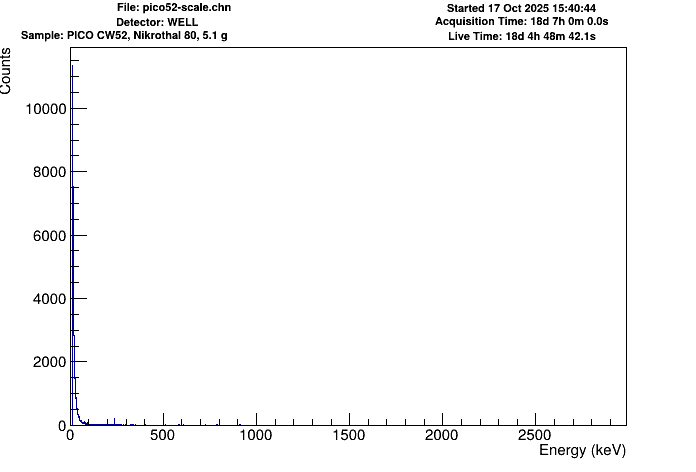 This page provides the results of gamma counting with the Well HPGe detector at SNOLAB for the sample of interest. Collected spectra are analyzed with a custom C++-based set of scripts. It is a root-based implementation. Peak detection efficiencies are estimated from analyzing the Geant4 MC simulations of the sample. Radioactive contamination levels of the sample from U/Th/K/Co/Cs isotopes are listed per line and per decay chain below.
